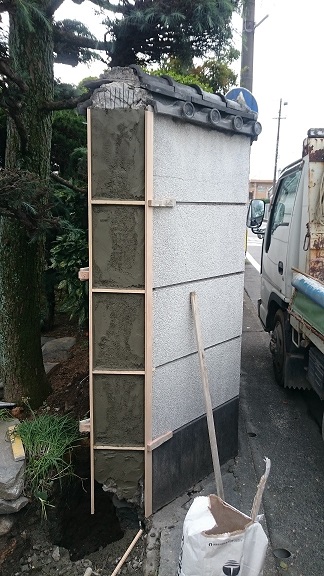 解体後の門の側面も白セメント+色粉+寒水石を混ぜて洗い出していきました。