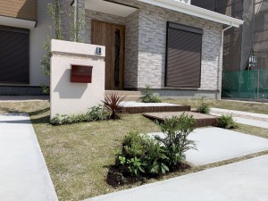 毎日の水やりが大変にはなりますが、芝が入るだけで建物も抜群に映えます