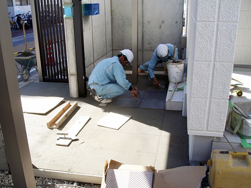 アプローチタイルも、こんな感じで下地モルタルを敷いて、ミリ単位で