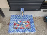 モザイクタイルを壁に埋め込んだ門袖壁。