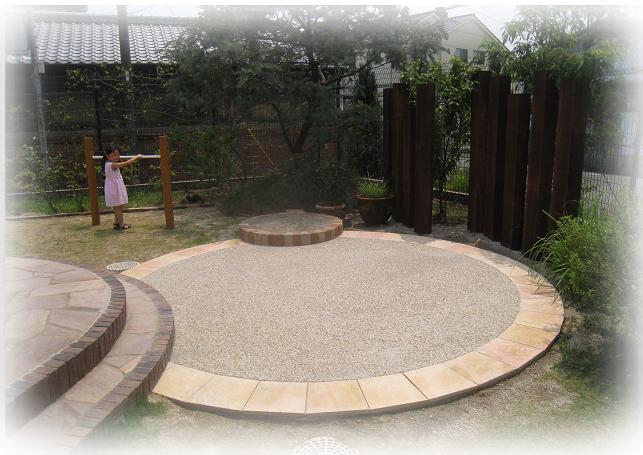 縁取りは300角のタイルで中は砂利の洗い出しにしました。